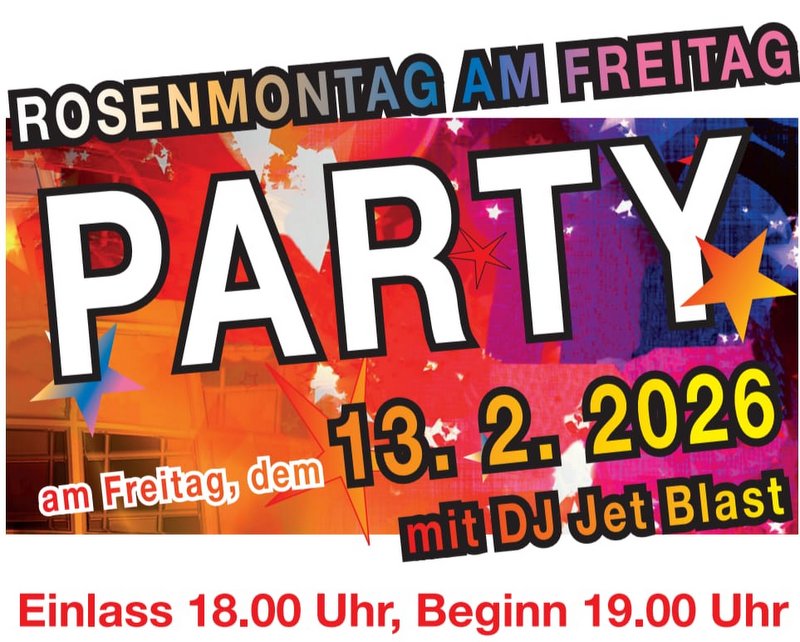 Der Tanzsportverein Mannheim-Rheinau e.V. lädt am 13.02.2026 zum "Rosenmontag am Freitag" mit DJ Jet Blast! Einlass ist um 18 Uhr im Bürgersaal des Nachbarschaftshauses. Für das leibliche Wohl ist wie immer bestens gesorgt. Karten kosten 10 Euro (inkl. ein Glas Sekt). Kartenbestellungen unter: tsv-kartenverkauf@gmx.de